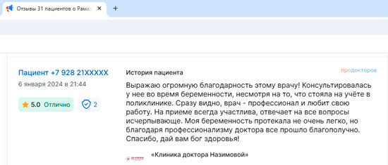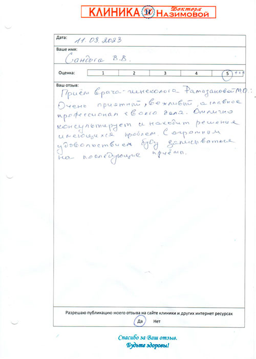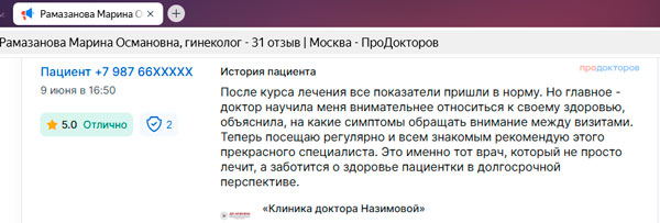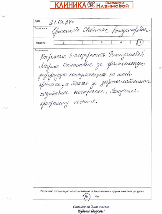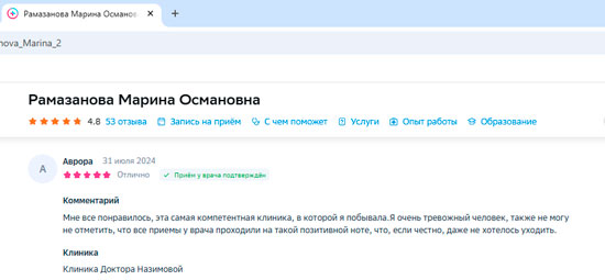 Выражаю благодарность Рамазановой Марине Османовне за грамотную развернутую консультацию по моей проблеме, а также за доброжелательное позитивное настроение. Получила программу лечения.