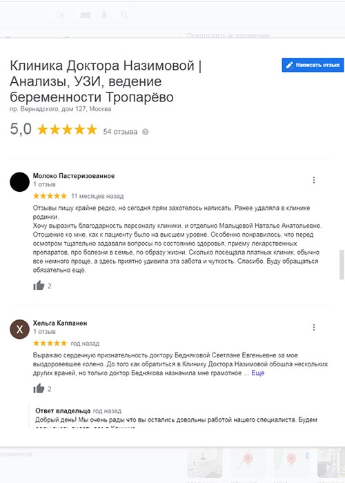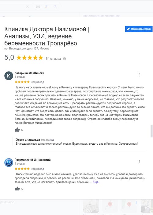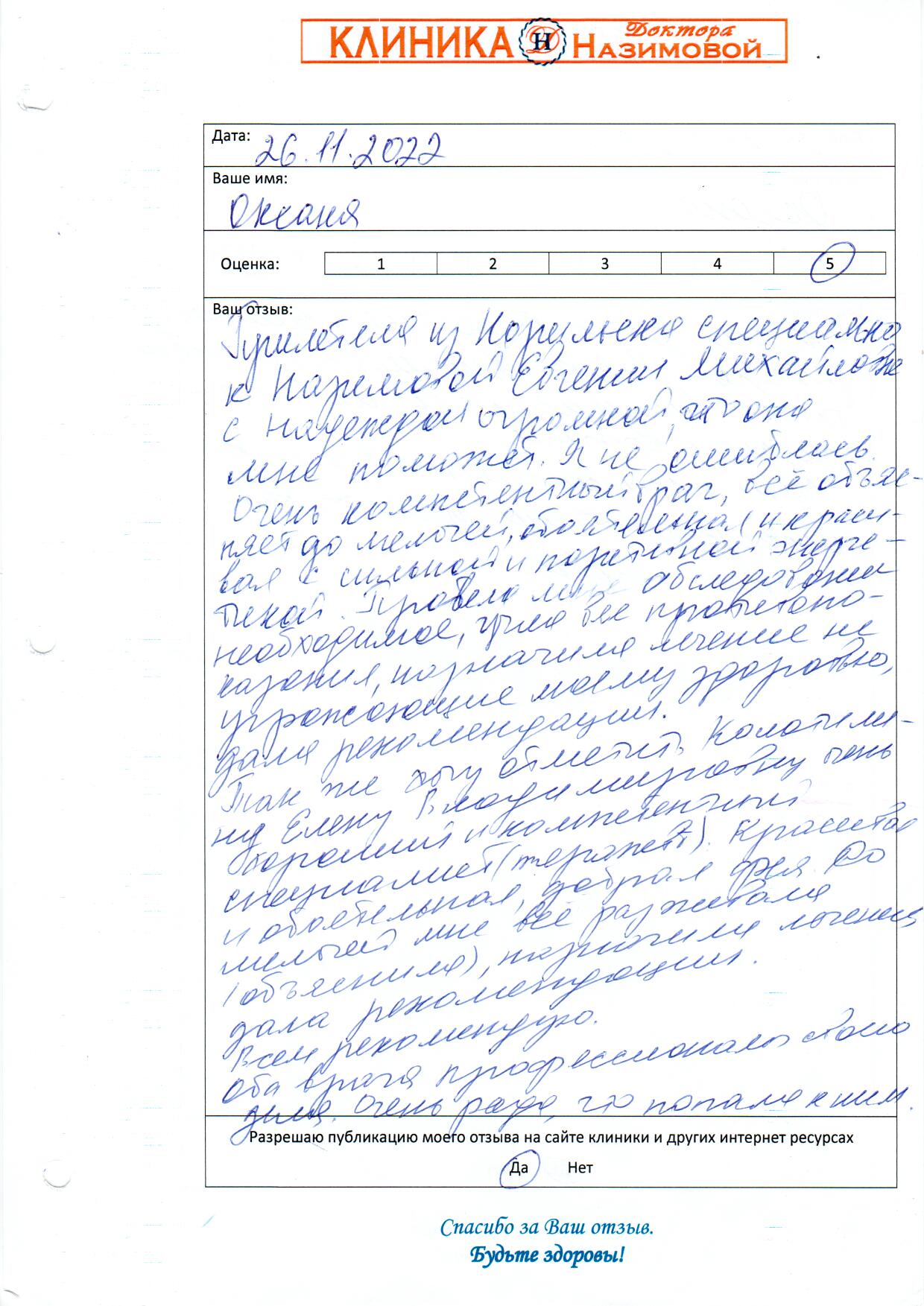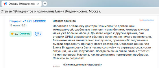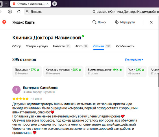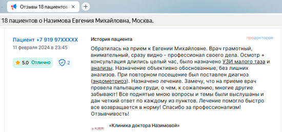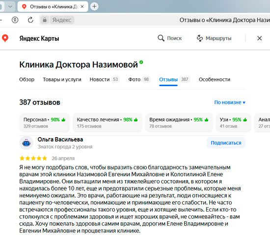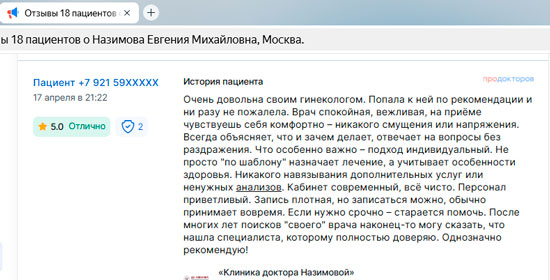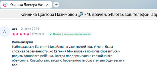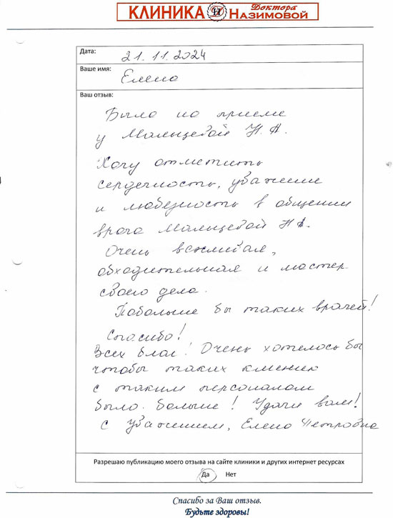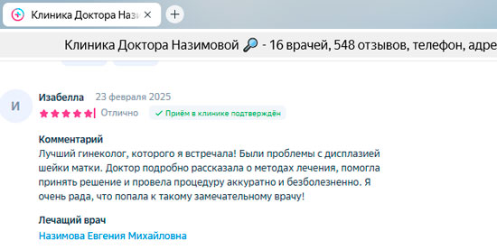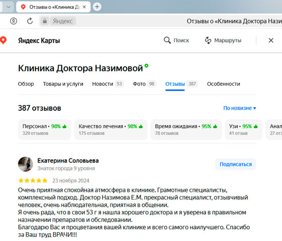 Не могу не оставить отзыв! Хожу в Клинику к главврачу Назимовой и хирургу. У меня было много проблем после неправильно сделанного кесарева, поэтому была очень рада, что наконец-то нашла решение своих проблем в Клинике Назимовой. Основательный подход ко всем пациентам – вот что меня подкупило! Лечение, конечно, у меня непростое, но главное, что результаты после долгих лет хождения по врачам уже есть. Препараты рекомендуют и подбирают хорошо, а главное все объясняют и только рекомендуют, то есть не такого, что вы должны это сделать и все. Нет. Объяснят, что будет если делать так и что будет если сделать по-другому. Корректируют лечение грамотно, мы постоянно на связи, подписалась теперь вот на инстаграм Назимовой Евгении Михайловны, периодически задаю вопросы)) Огромное спасибо всему персоналу и лично Евгении Михайловне!