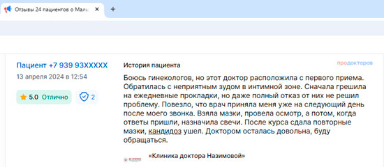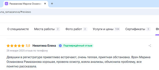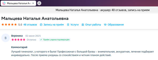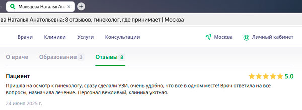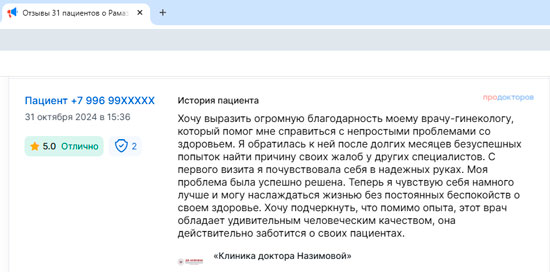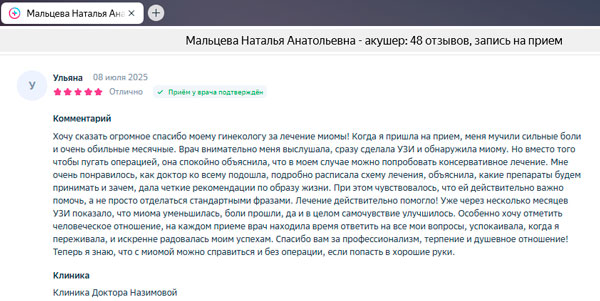 Хочу выразить огромную благодарность моему врачу-гинекологу, который помог мне справиться с непростыми проблемами со здоровьем. Я обратилась к ней после долгих месяцев безуспешных попыток найти причину своих жалоб у других специалистов. С первого визита я почувствовала себя в надежных руках. Моя проблема была успешно решена. Теперь я чувствую себя намного лучше и могу наслаждаться жизнью без постоянных беспокойств о своем здоровье. Хочу подчеркнуть, что помимо опыта, этот врач обладает удивительным человеческим качеством, она действительно заботится о своих пациентах.