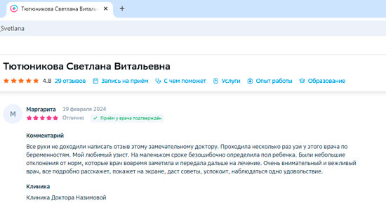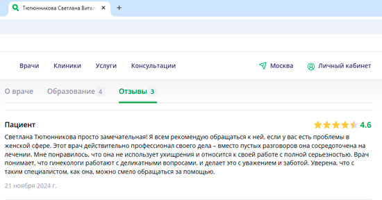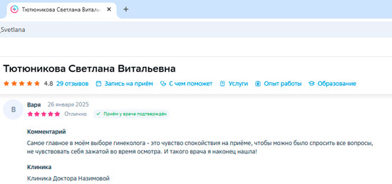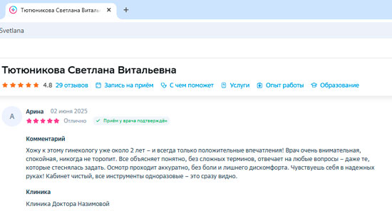 Светлана Тютюникова просто замечательная! Я всем рекомендую обращаться к ней, если у вас есть проблемы в женской сфере. Этот врач действительно профессионал своего дела – вместо пустых разговоров она сосредоточена на лечении. Мне понравилось, что она не использует ухищрения и относится к своей работе с полной серьезностью. Врач понимает, что гинекологи работают с деликатными вопросами, и делает это с уважением и заботой. Уверена, что с таким специалистом, как она, можно смело обращаться за помощью.