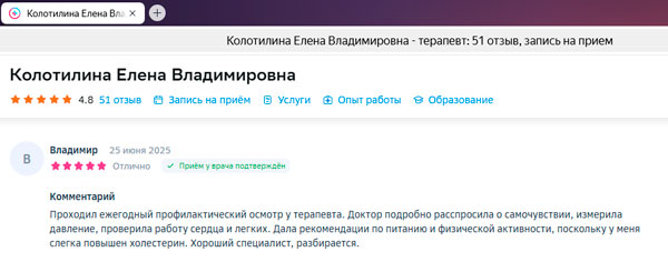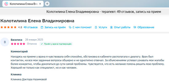 Прилетела из Норильска специально к Назимовой Евгении Михайловне, с надеждой огромной ,что она мне поможет. Я не ошиблась . Очень компетентный врач,всё объясняет до мелочей , обаятельная и красивая, с сильной и позитивной энергетикой. Провела мне необходимые обследования, учла все противопоказания и назначила лечение, не угрожающее моему здоровью, дала рекомендации. Также хочу отметить Колотилину Елену Владимировну.Очень хороший, компетентный специалист(терапевт).Красивая и обаятельная,добрая фея. До мелочей мне все объяснила,назначила лечение, дала рекомендации. Оба врача профессионалы своего дела.Очень рада ,что попала к ним. Также хочу отметить администраторов, всегда вежливы, компетентны,очень мне помогли с записью к врачам. Очень признательна всем,кто непосредственно участвовал в моем процессе...