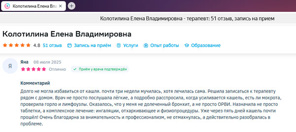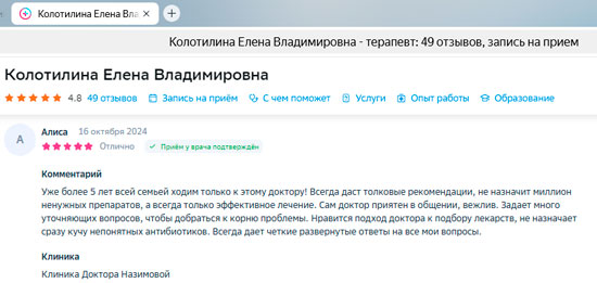 Очень грамотный, позитивный и ответственный врач. Лечусь только в Клинике Назимовой. Нравится всё, назначения всегда эффективные, лечение помогает. Подход к пациенту удивляет, внимание, советы, всё супер!