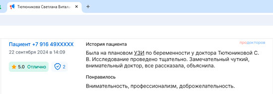 Была на плановом УЗИ​ по беременности у доктора Тютюниковой С. В. Исследование проведено тщательно. Замечательный чуткий, внимательный доктор, все рассказала, объяснила. Понравилось: Внимательность, профессионализм, доброжелательность.