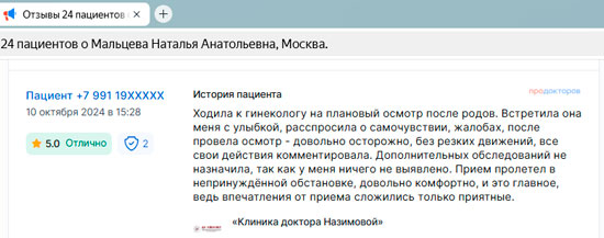 Хожу к этому гинекологу уже около 2 лет – и всегда только положительные впечатления! Врач очень внимательная, спокойная, никогда не торопит. Все объясняет понятно, без сложных терминов, отвечает на любые вопросы – даже те, которые стеснялась задать. Осмотр проходит аккуратно, без боли и лишнего дискомфорта. Чувствуешь себя в надежных руках! Кабинет чистый, все инструменты одноразовые – это сразу видно.