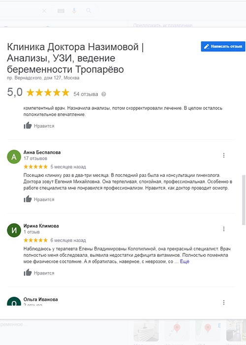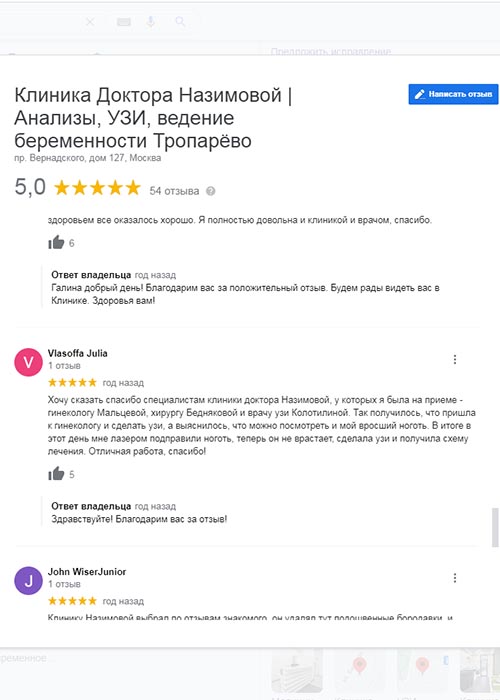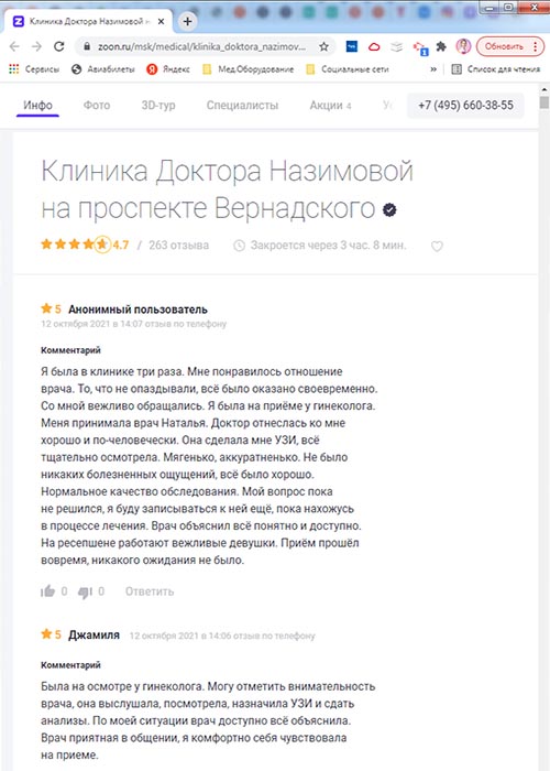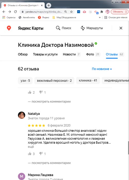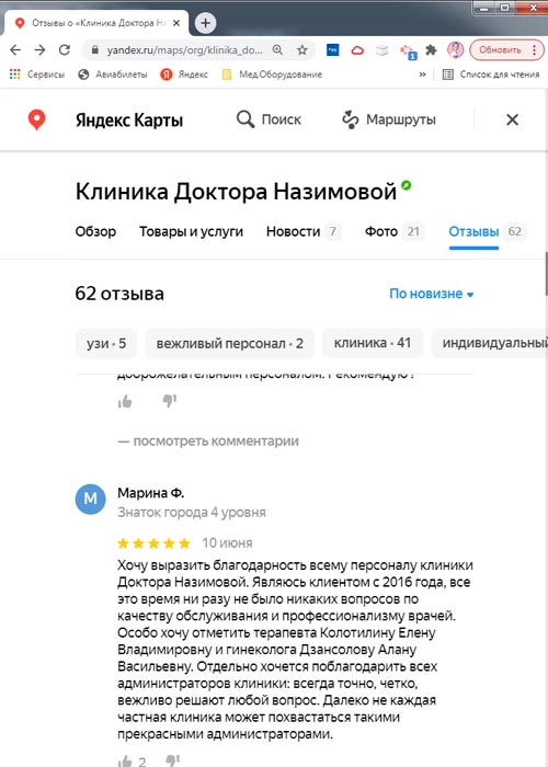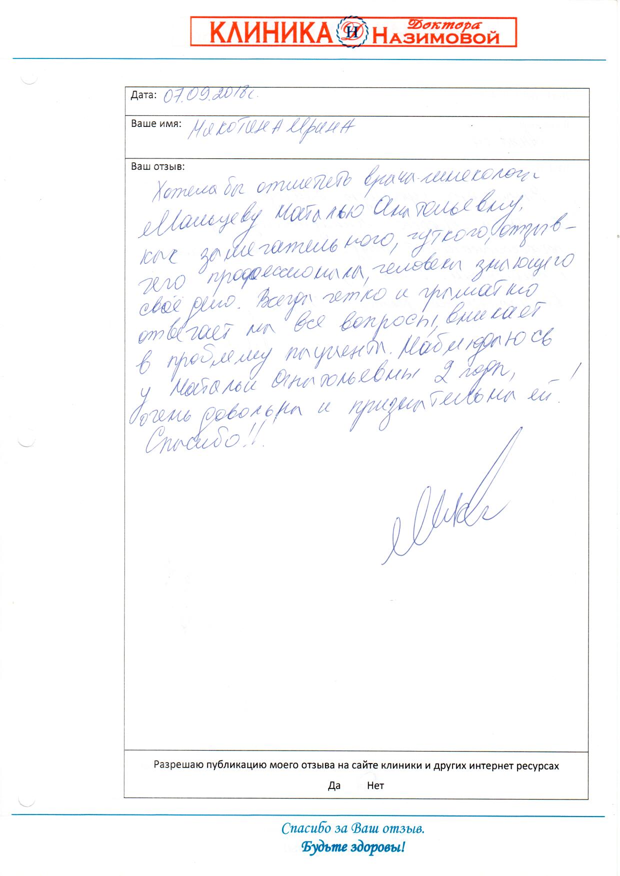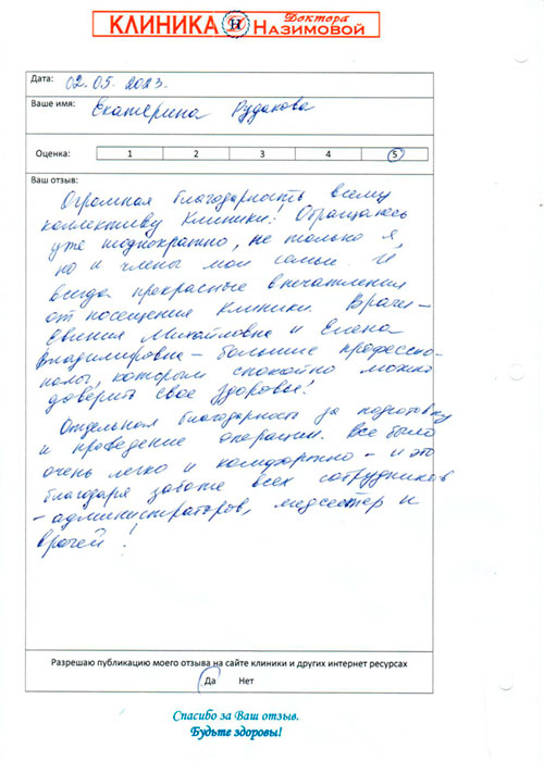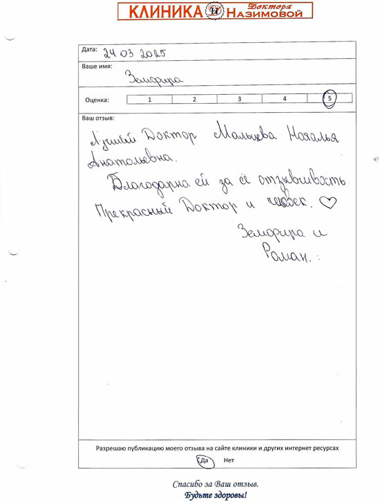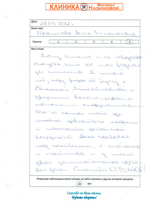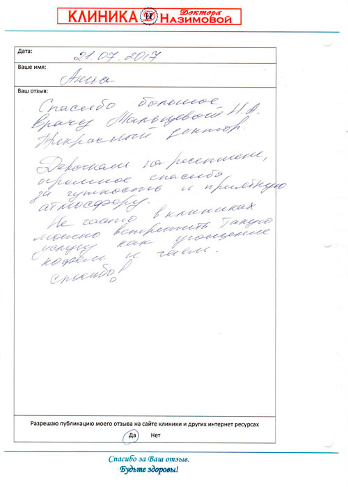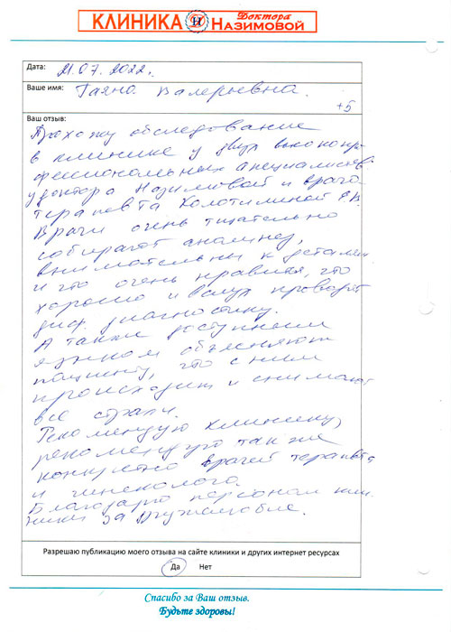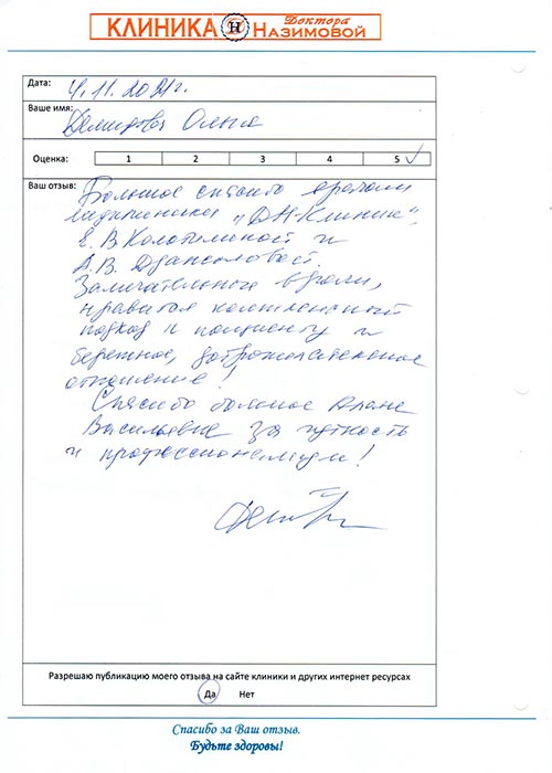 Хочу сказать спасибо специалистам клиники доктора Назимовой, у которых я была на приеме - гинекологу Мальцевой, хирургу Бедняковой и врачу узи Колотилиной. Так получилось, что пришла к гинекологу и сделать узи, а выяснилось, что можно посмотреть и мой вросший ноготь. В итоге в этот день мне лазером подправили ноготь, теперь он не врастает, сделала узи и получила схему лечения. Отличная работа, спасибо!