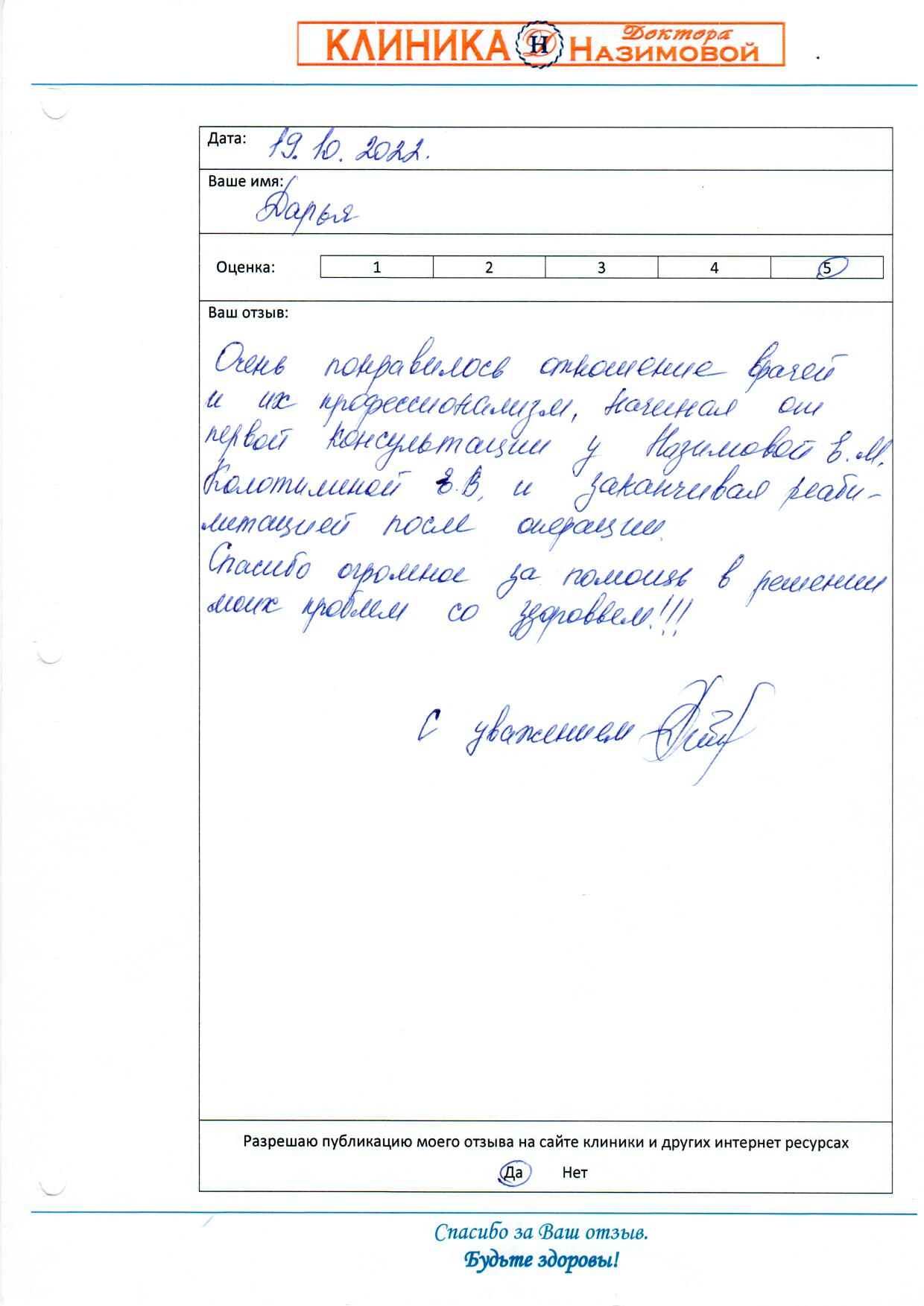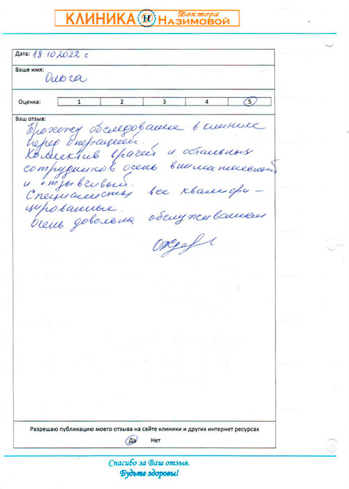 Очень понравилось отношение врачей и их профессионализм, начиная от первой консультации у Назимовой Е.М.,Колотилинй Е.В. и заканчивая реабилитацией после операции. Спасибо огромное за помощь в решении моих проблем со здоровьем.