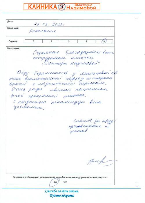 Выражаю огромную,сердечную благодарность от всего сердца Назимовой Евгении Михайловне. Благодаря ей у меня двое здоровых,замечательных детей. Я стала мамой во второй раз в 40 лет. С благодарностью,Вера Васильевна.