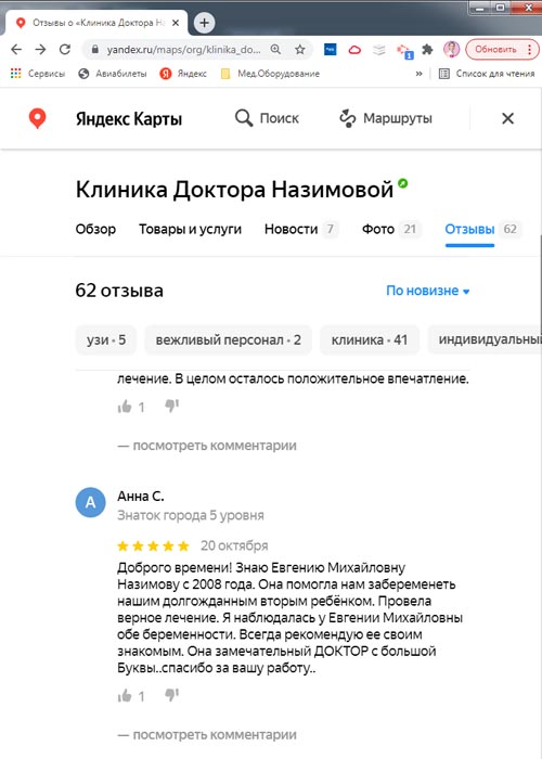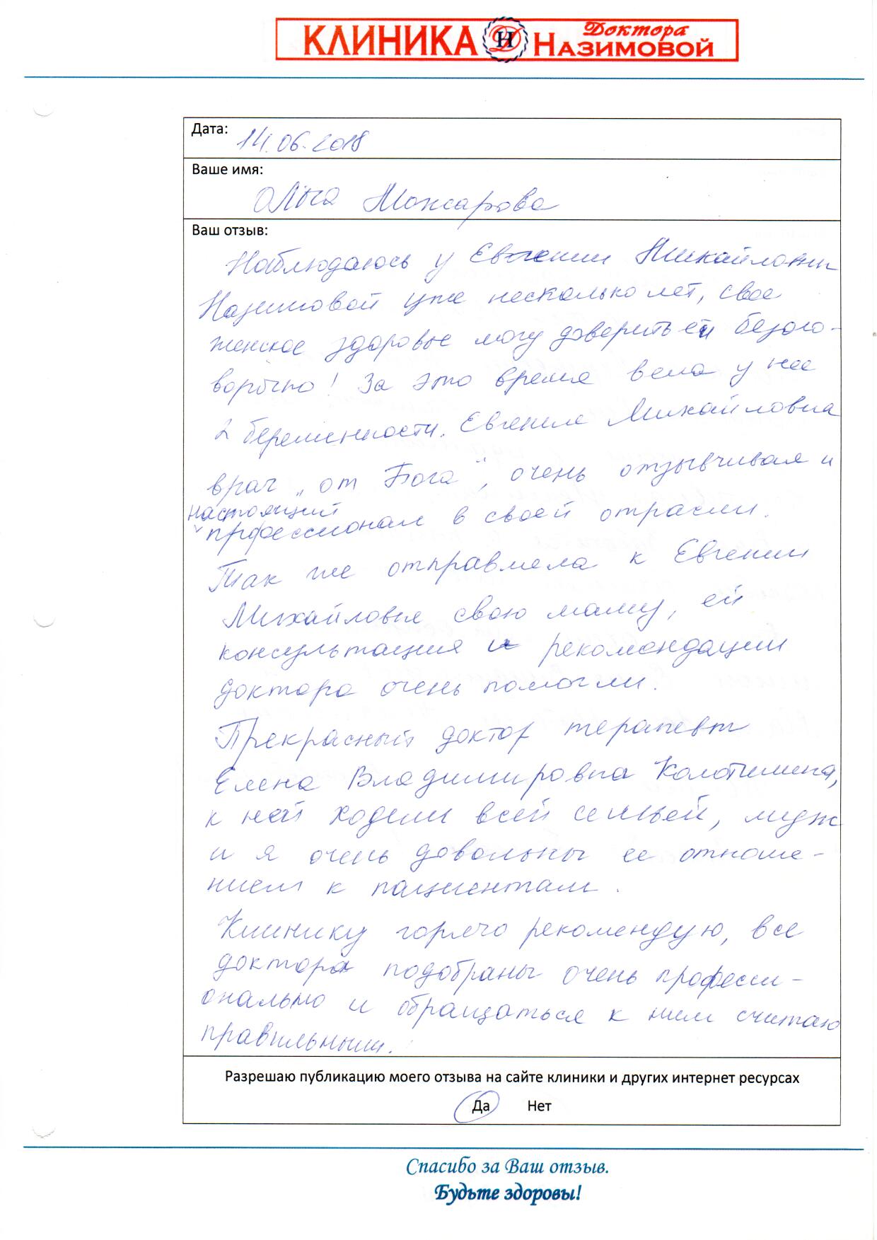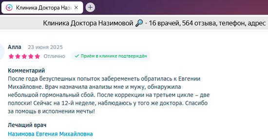 Хочу выразить огромную благодарность Доктору (да, доктору с большой буквы, настоящему, чуткому, профессиональному и человечному) - Назимовой Евгении Михайловне. Она вдохнула в меня жизнь, я сама доктор, сосудистый хирург, начались проблемы с «женским здоровьем», побывала до Евгении М. у 5 гинекологов (со стажем, оперирующих и нет) , и только Евгения Михайловна так щепетильно, профессионально и чутко отнеслась ко мне и поставила правильный диагноз, назначила адекватное лечение. Низкий поклон и дай Бог Вам крепкого здоровья и процветания вашей клинике, Евгения Михайловна. У кого есть проблемы, кто не знает что делать и кажется что все потеряно - смело, безотлагательно, не жалея денег и времени обращайтесь к Евгении Михайловне, которая собрала такой прекрасный коллектив ( хочется отметить прекрасного терапевта, врача УЗ- диагностики Елену Владимировну, отдельное большое человеческое спасибо). С уважением Анна Н.