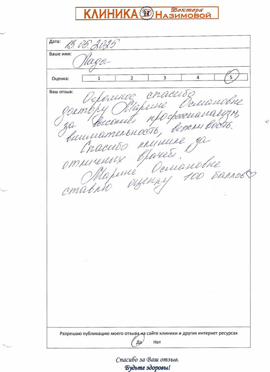 Огромное спасибо доктору Марине Османовне за высокий профессионализм, внимательность, вежливость. Спасибо клинике за отличных врачей. Марине Османовне ставлю оценку 100 баллов.
