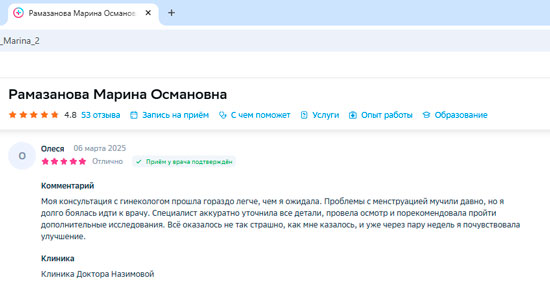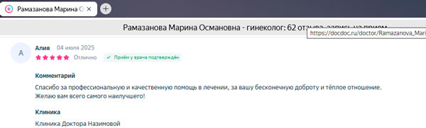 Была на приеме у гинеколога Рамазановой Марины Османовны. Очень внимательная, разъяснила все возникшие вопросы. Провела очень деликатно осмотр и небольшое хирургическое вмешательство. Крайне рекомендую Марину Османовну и клинику в целом с очень внимательным персоналом. Благодарю!