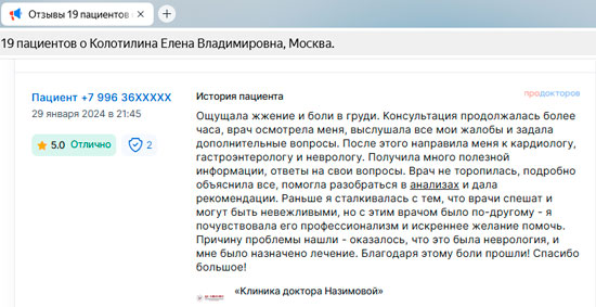 Очень приятная спокойная атмосфера в клинике. Грамотные специалисты, комплексный подход. Доктор Назимова Е.М. прекрасный специалист, отзывчивый человек, очень наблюдательная, приятная в общении. Я очень рада, что в свои 53 г я нашла хорошего доктора и я уверена в правильном назначении препаратов и обследовании. Благодарю Вас и процветания вашей клинике и всего самого наилучшего. Спасибо за Ваш труд ВРАЧИ!!!