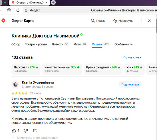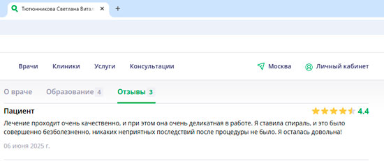 Была на приеме у Тютюниковой Светланы Витальевны. Потрясающий профессионал своего дела. Все подробно объяснила, наглядно показала, предложила варианты лечения проблемы, мучающей меня уже много лет. Ответила на все мои вопросы очень подробно. Безмерно рада найти такого доктора. Клиника в целом произвела очень положительное впечатление, отзывчивый персонал, качественное обслуживание.
