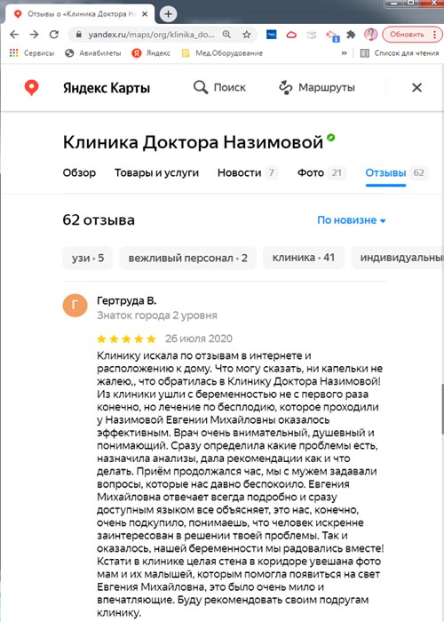 Доктора Назимову Евгению Михайловну я узнала из обучающего курса и обратилась к ней за консультацией по поводу проводимой терапии. Понравились внимание доктора, квалификация и изучение всех предыдущих анализов и обследований. Качественно проведен гинекологический осмотр, и плюс неожиданное, но очень нужный анализ силы интимных мышц. Рекомендации даны подробные по дальнейшим действиям и лечению. Спасибо большое! Давно искала именно такого доктора!