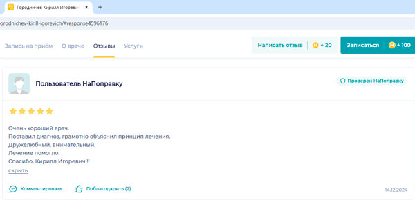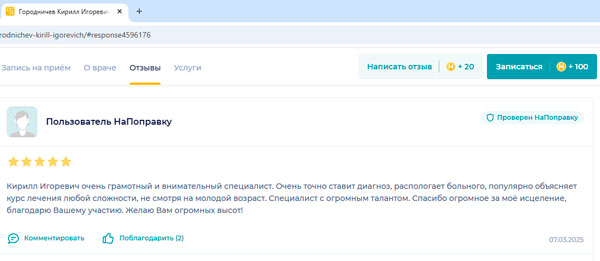 Кирилл Игоревич очень грамотный и внимательный специалист. Очень точно ставит диагноз, располагает больного, популярно объясняет курс лечения любой сложности, не смотря на молодой возраст. Специалист с огромным талантом. Спасибо огромное за моё исцеление, благодарю Вашему участию. Желаю Вам огромных высот!