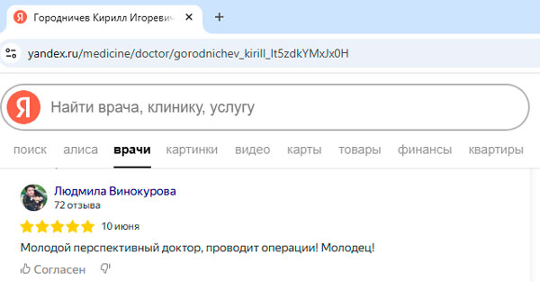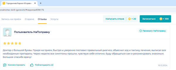 Доктор с большой буквы. Придя на прием, быстро и уверенно поставил правильный диагноз, объяснил ход и тактику лечения, выписал все необходимые препараты. Через неделю все симптомы прошли, чувствую себя отлично. Буду обращаться сам и рекомендовать знакомым. Большое спасибо врачу!
