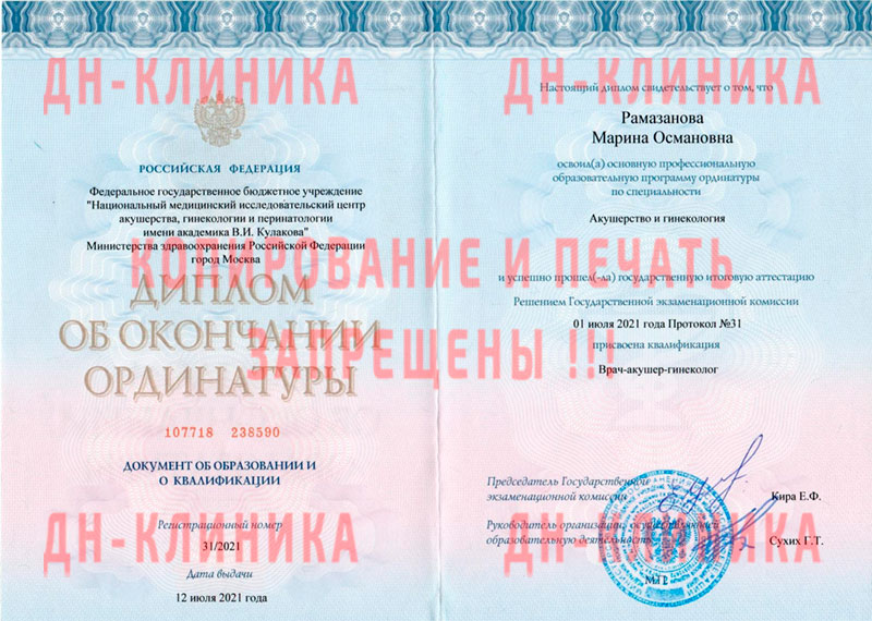 • 2021 г. – Окончила клиническую ординатуру ФГБУ «НМИЦ АГП им. В. И. Кулакова» МЗ РФ по специальности «Акушерство и гинекология».