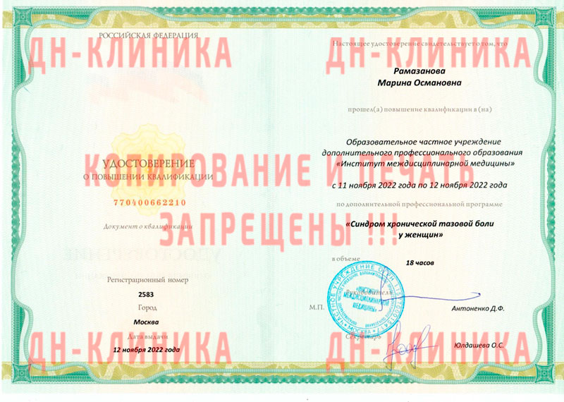 • 2022 г. – Сертификационный цикл «Синдром хронической тазовой боли».