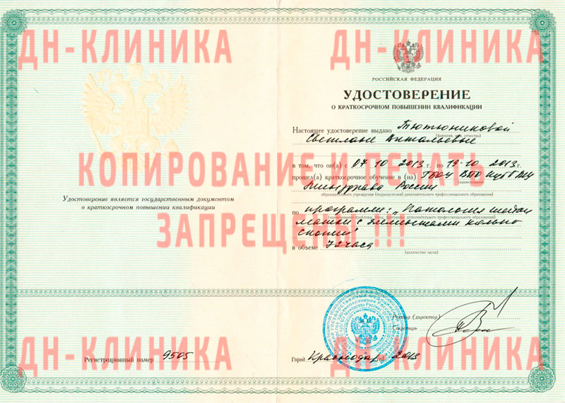 • 2013г. - Повышение квалификации по программе "Потология шейки матки с элементами кольпоскопии",ГБОУ ВПО КубГМУ Минздрава России.