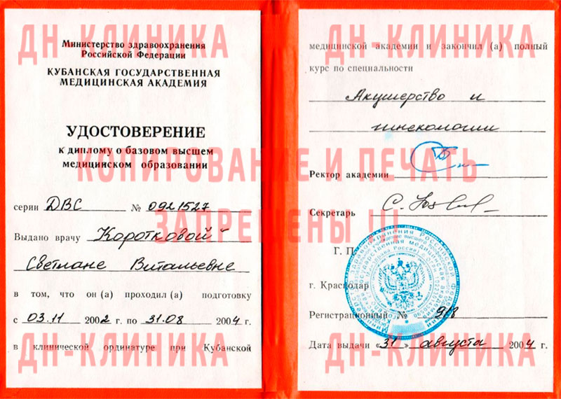 • 2004г. - Кубанская Государственная Медицинская Академия,ФППВ- Клиническая  ординатура на кафедре «Акушерства и Гинекологии»,