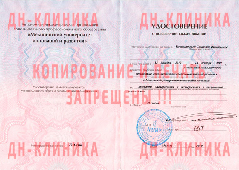 • 2019г. - Повышение квалификации по программе "Лапароскопия и гистероскопия в оперативной гинекологии " АНО ДПО "Медицинский университет инноваций и развития".