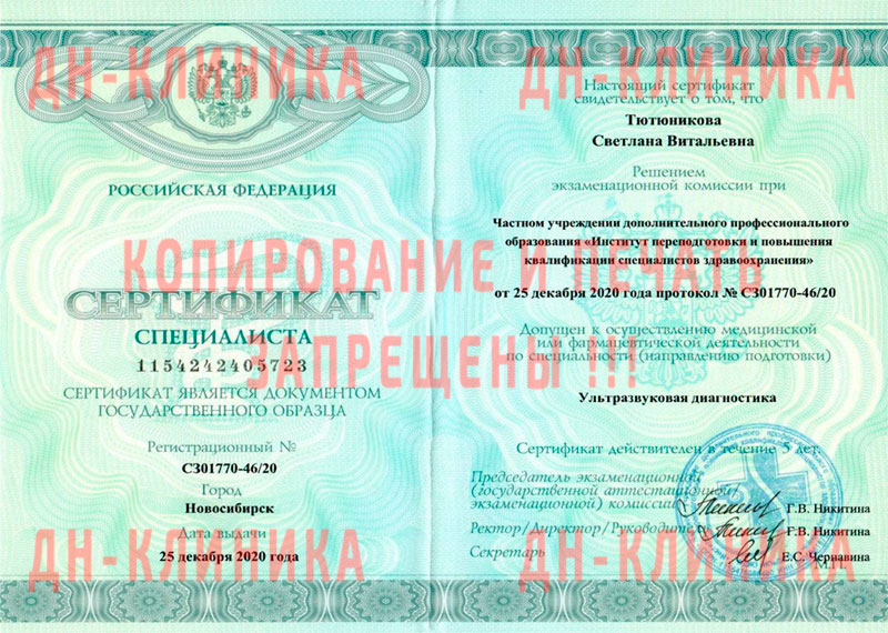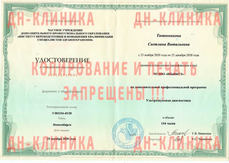 • 2020г. - Сертификационный цикл по ультразвуковой диагностике в Институте переподготовки и повышения квалификации специалистов здравоохранения",г.Новосибирск.