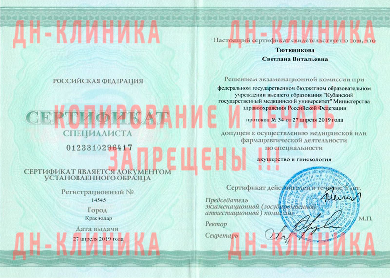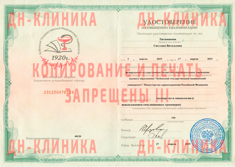 • 2019г. - Сертификационный цикл по акушерству и гинекологии, ФГБОУ ВО КГМУ,г.Краснодар.