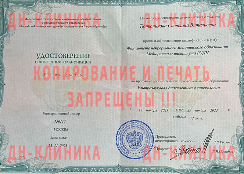 • 2023г.- Повышение квалификации по программе "Ультразвуковая диагностика в гинекологии",факультет непрерывного медицинского образования Медицинского института РУДН.