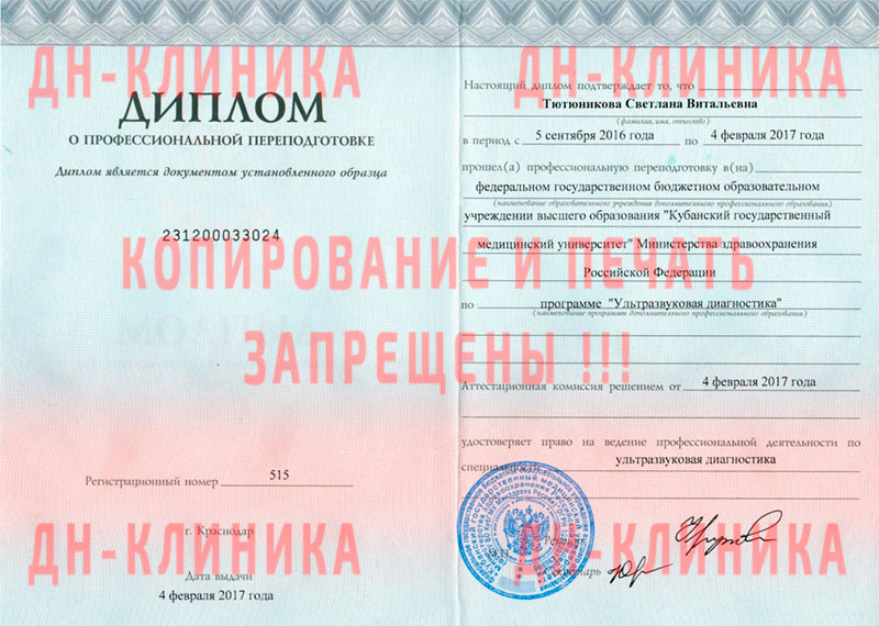 • 2017г. - Профессиональная переподготовка по специальности «Ультразвуковая диагностика».Кубанский государственный медицинский университет.