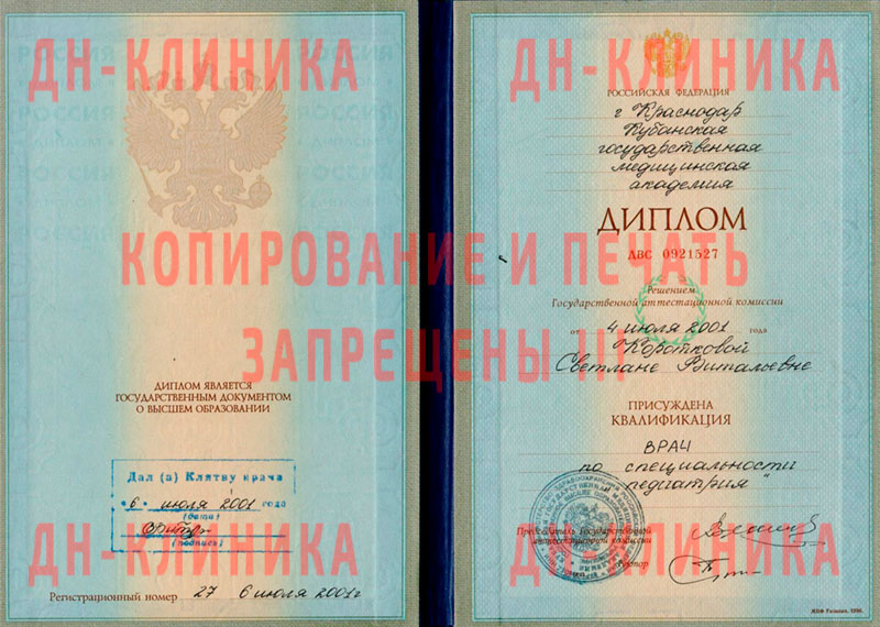 • 2001г. - Кубанская Государственная Медицинская Академия,  специальность "Педиатрия".